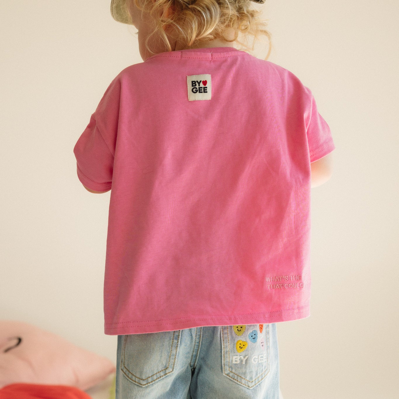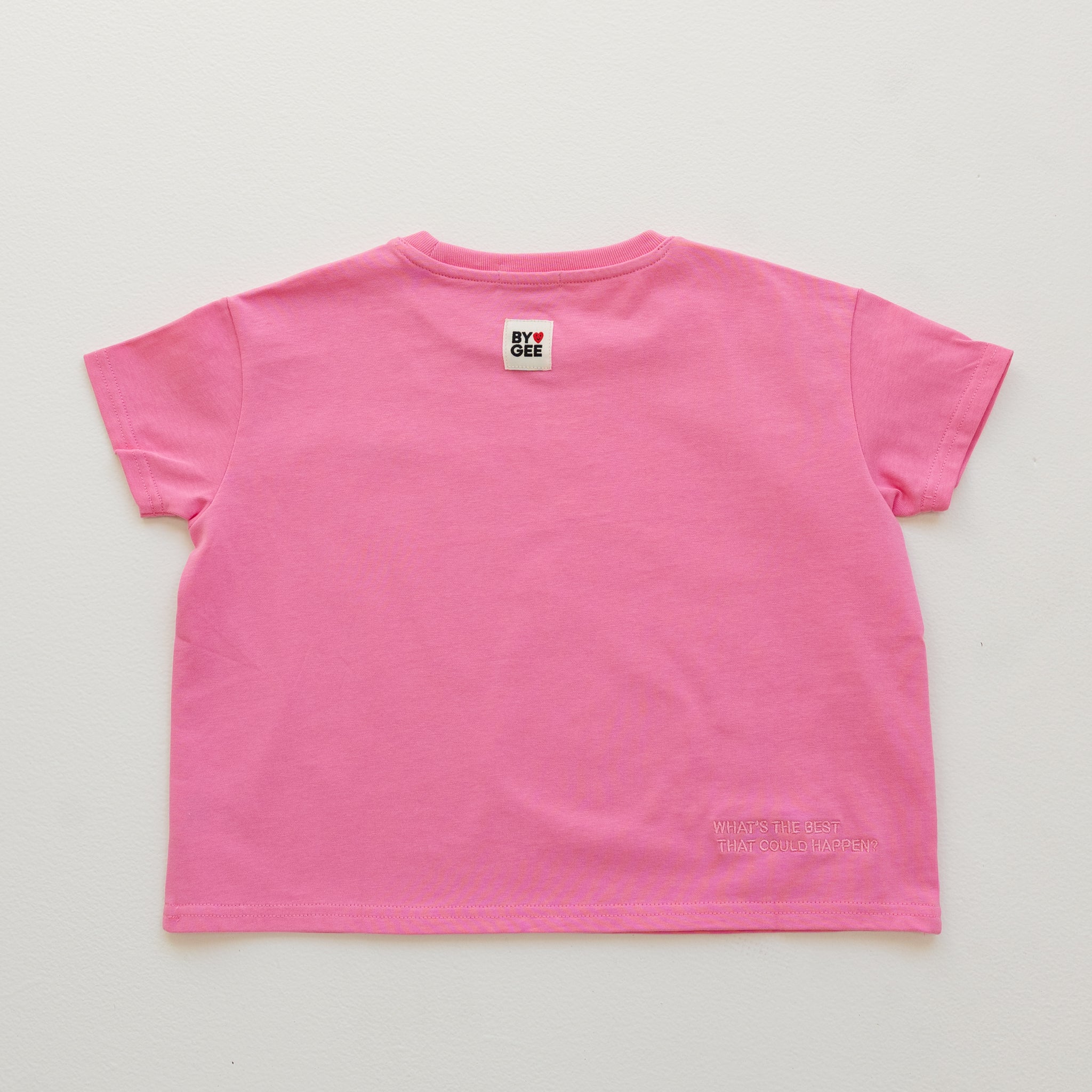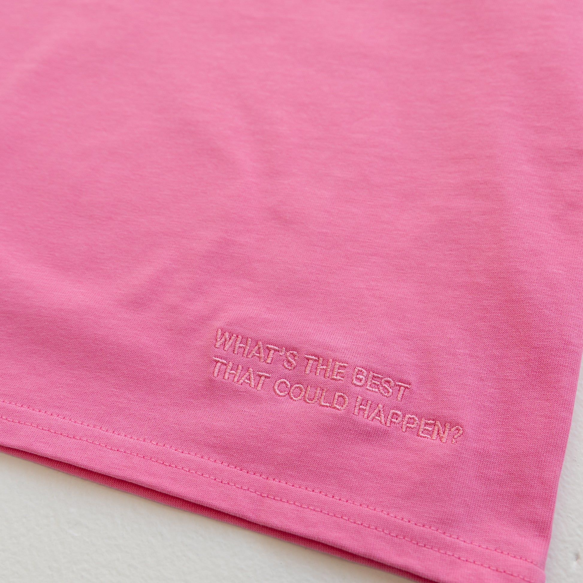 The perfect staple for your kids wardrobe. Made from GOTS approved organic cotton this is a beautiful fabric that gets softer with every wash. Mix and match with everything your child already owns for endless outfit combinations. Our Hot Pink colour way features the 'WHat's the best that could happen?' affirmation in tonal embroidery on the back hem.
